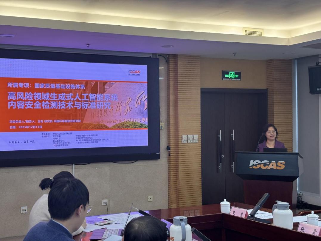 12月13日,国家重点研发计划“国家质量基础设施体系”重点专项“高风险领域生成式人工智能系统内容安全检测技术与标准研究”项目年度研讨会在中国科学院软件研究所召开。项目主责单位国家市场监督管理总局科技和信息化司副司长潘牧,项目管理部门中国21世纪议程管理中心项目主管王浩,重点专项总体专家组专家中国标准化研究院研究员刘碧松、中国机械总院标准化研究院常务副院长李海斌,项目跟踪咨询专家组专家哈尔滨工业大学网络空间安全学院院长姜伟、中国电子科技集团有限公司正高级工程师刘奎恩、公安部第三研究所等保中心主任助理王勇、国家计算机网络应急技术处理协调中心等专家,项目应用示范单位代表浙江省公安厅网安总队副总队长张燕春,项目牵头单位中国科学院软件所副所长田丰等各方代表和项目组成员共30余人参加了会议。