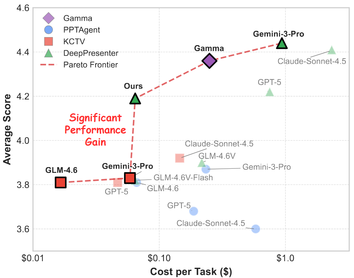 为验证所提方法的有效性,研究团队在预留的128个测试任务上使用PPTEval进行了系统评测,并与多种主流幻灯片生成方案进行了对比。结果表明,DeepPresenter(pptagent 2.0)的9B版本取得了 4.19 的综合评分,与闭源模型GPT-5(4.22)表现接近,且显著优于其他幻灯片生成方案。通过成本—性能分析,DeepPresenter-9B处于前沿曲线的最优平衡点位置,能以远低于闭源模型的算力成本实现同等级别的生成质量。所有生成内容均输出为可编辑的pptx格式,支持用户自由修改与二次创作。