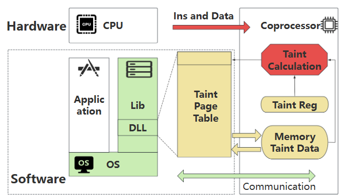针对这一挑战,团队提出了软硬件系统结合的多标签(Multi-tag)分析方案MulcoTaint。该方案基于CPU流水线和协处理器架构,将程序执行逻辑和数据流分析逻辑分离,并通过将数据流标签计算向量化,利用专用协处理器进行硬件加速。同时,团队在软件层面设计了配套机制,使其能够支持二进制/源码的字节级多标签数据流分析。
