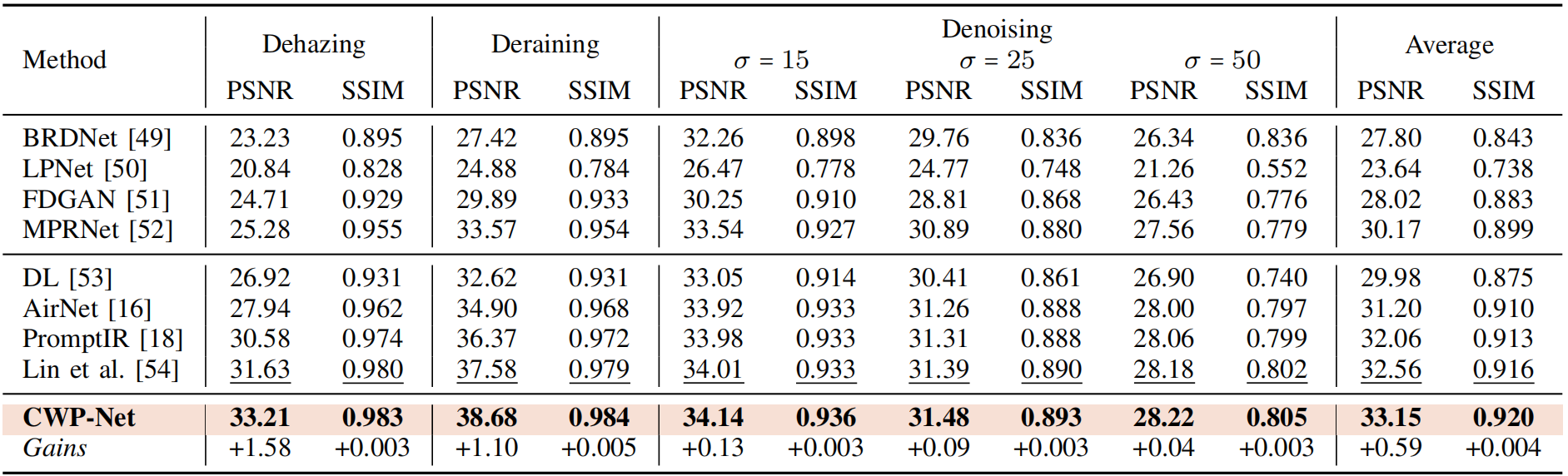 为验证方法的有效性,研究团队在多个标准图像恢复任务上开展系统评估,涵盖图像去噪、去雨、去雾、去模糊以及低照度增强等。实验结果表明,在统一图像恢复设置下,CWP-Net在多个基准数据集上均优于现有主流方法,并在平均性能指标上取得显著提升。在五种退化模式的综合评估中,CWP-Net相较现有方法平均峰值信噪比(PSNR)提升约0.59dB,去雾和去雨任务分别取得1.58 dB和1.10 dB的性能提升。此外,在均衡测试集开展的统一评估进一步验证了CWP-Net在实际场景中的优秀泛化能力。